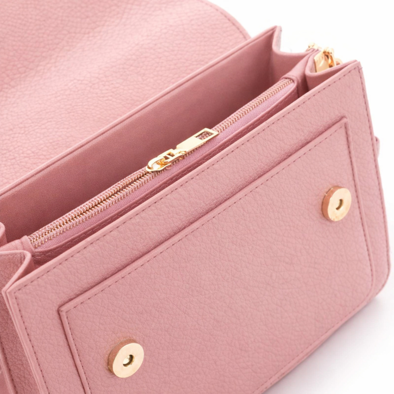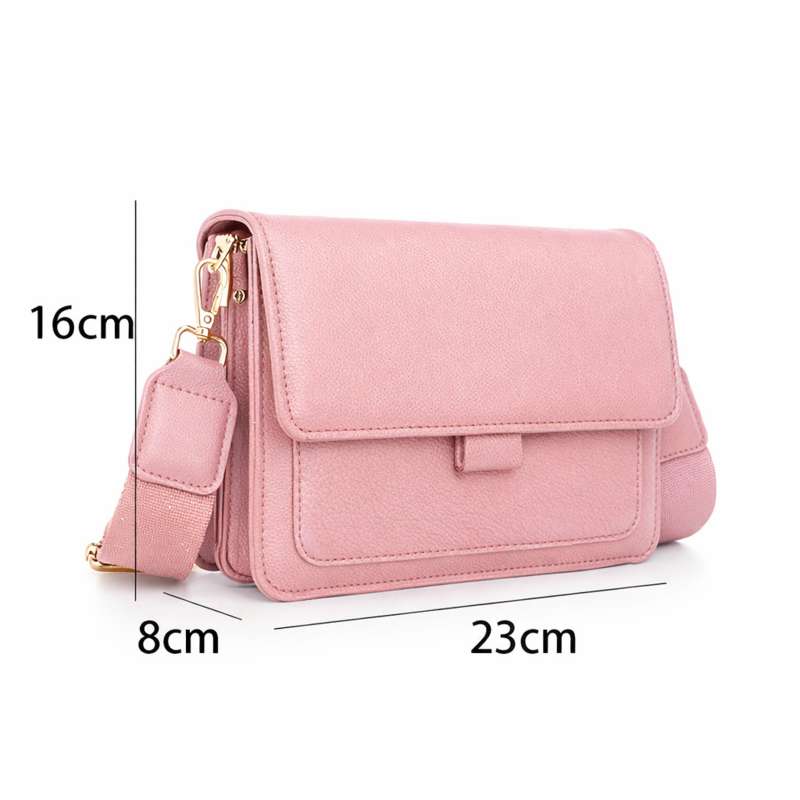 Prachtige crossbody schoudertas in poeder-rose met luxe band. De tas heeft drukknopen en 3 vakken, het middelste vak sluit je met een rits. De tas heeft 2 schouderriemen, een in de kleur van de tas de ander met motief zie foto.
