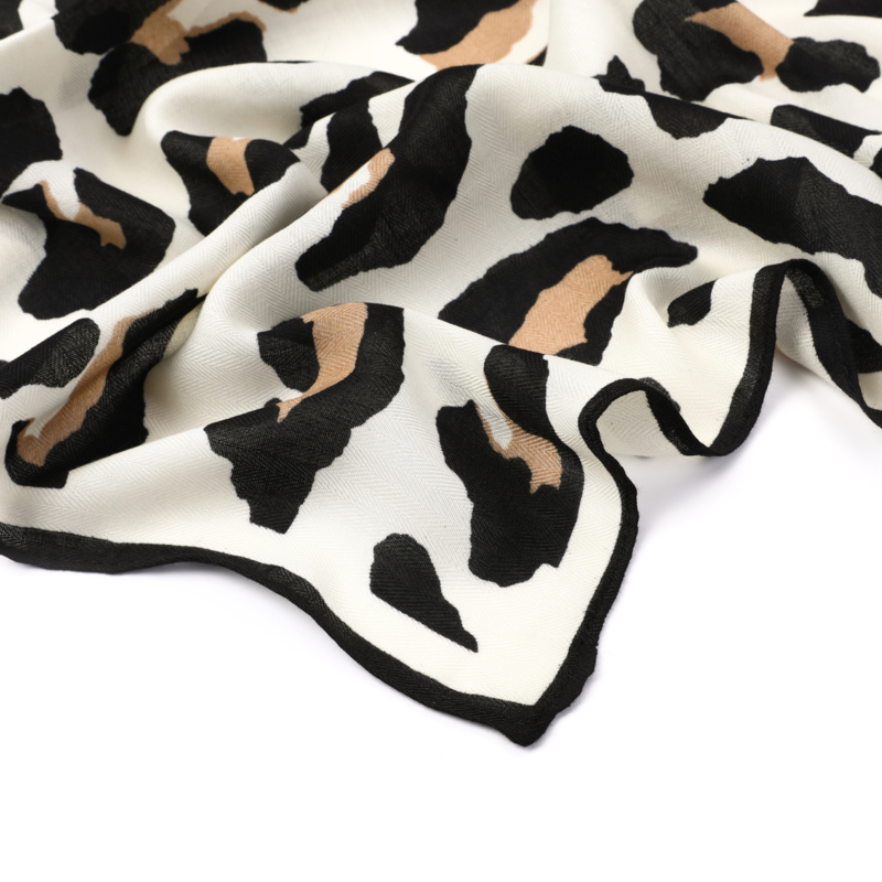 De panterprint in zwart, beige en zachte bruintinten geeft een levendig effect, terwijl de lichte achtergrond zorgt voor rust en balans. Hierdoor blijft de sjaal goed draagbaar en eenvoudig te combineren.